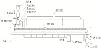 為物料的連續(xù)進(jìn)出,采用雙級真空擋板閥裝置。該裝置由進(jìn)料斗、緩沖倉、上真空擋板閥、暫存?zhèn)}、下真空擋板閥、接口等部分組成。同時(shí),在進(jìn)料端輔以電磁布料裝置,使物料均勻分布于傳送帶上。其動作過程為,初始狀態(tài)上、下真空擋板閥均閉合,物料經(jīng)進(jìn)料斗進(jìn)入緩沖倉,達(dá)到一定質(zhì)量后,上真空擋板閥首先打開,物料進(jìn)入緩沖倉,然后上真空擋板閥關(guān)閉,下真空擋板閥打開,物料經(jīng)接口進(jìn)入設(shè)備內(nèi)部,下真空擋板閥關(guān)閉,完成一動作循環(huán),準(zhǔn)備進(jìn)入下一循環(huán)。輔助的布料裝置,了間隙時(shí)間內(nèi),物料的連續(xù)性。真空擋板閥采用電動控制,同時(shí)擋板上嵌有食品級硅橡膠密封材料用以真空密封,接口處有導(dǎo)電材料密封微波。